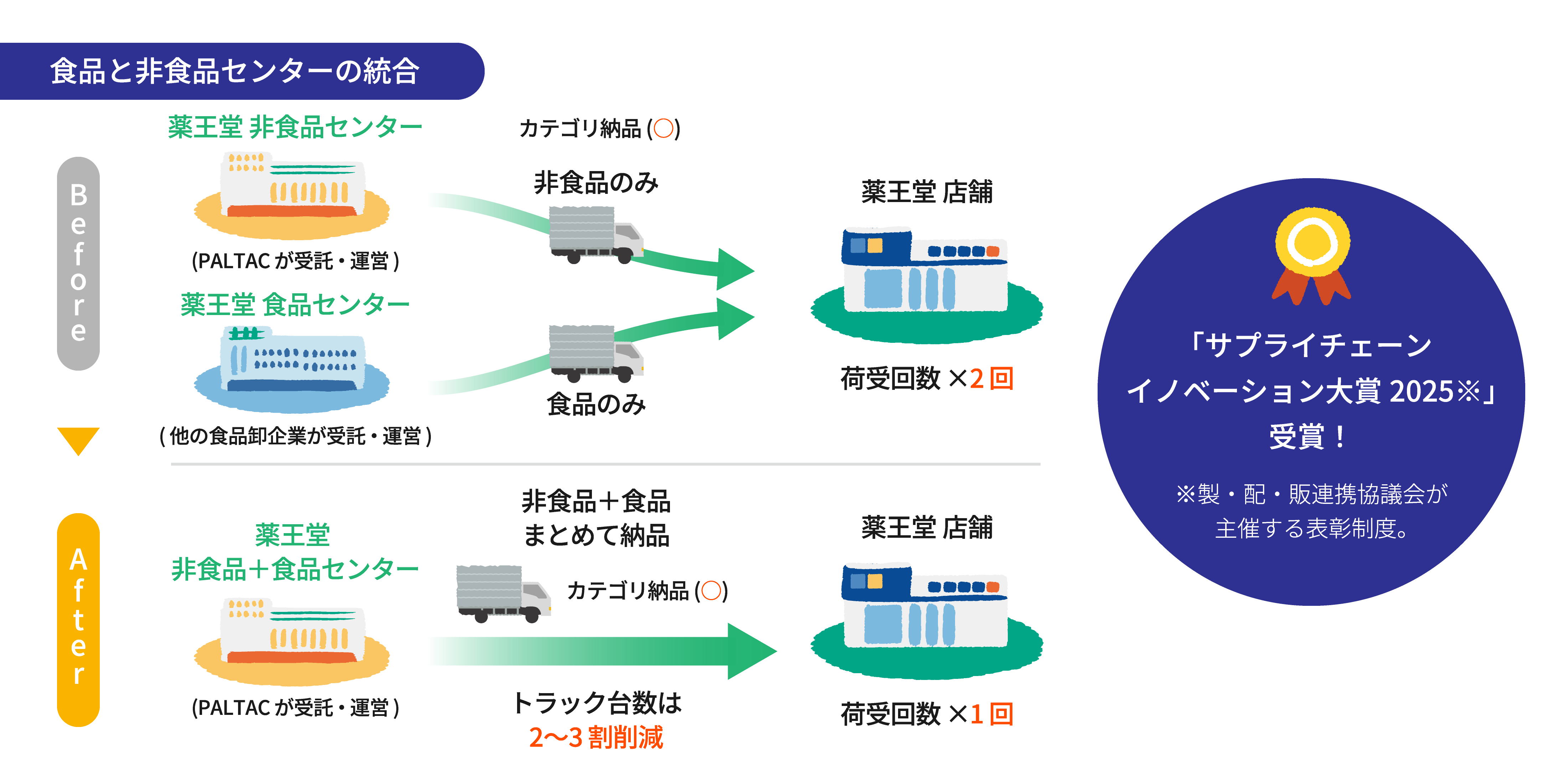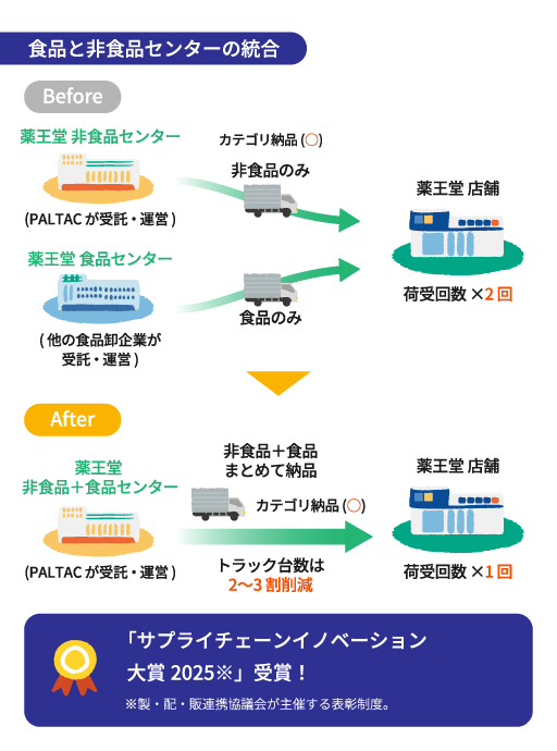 トラックドライバーの不足や環境問題など、社会が抱える課題に向き合うため、薬王堂では、新たな取り組みが始まっています。これまで「食品」と「非食品」に分かれていた物流センターをひとつに統合。その結果、配送に必要な人やトラックの数を減らし、二酸化炭素の排出量も2~3割カットすることができました。今後は低温物流センターも再構築し、鮮度向上や廃棄削減につなげていきます。薬王堂は、持続可能な社会への貢献を目指していきます。